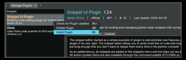 In the search box type in Snippet UI Plugin. Once displayed, right click the Snippet UI Entry and click on Install Plugin, as shown in Figure 4.