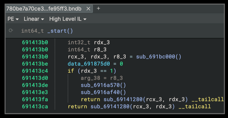 Once the sample has been loaded and processed by Binary Ninja, the user interface will navigate to the _start function (AddressOfEntryPoint from the PE header) and display the High Level Intermediate Language (HLIL) representation of this function (Figure 5).
